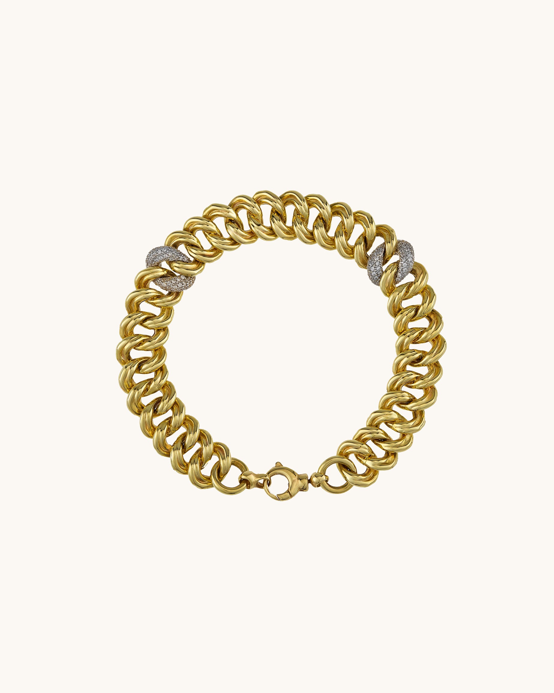 Burgu zincir dokusunu ışıltılı taş detaylarıyla buluşturan bu modern tasarım, hacimli yapısı ve zarif detaylarıyla günün her anında stilinize göz alıcı bir parlaklık katar.