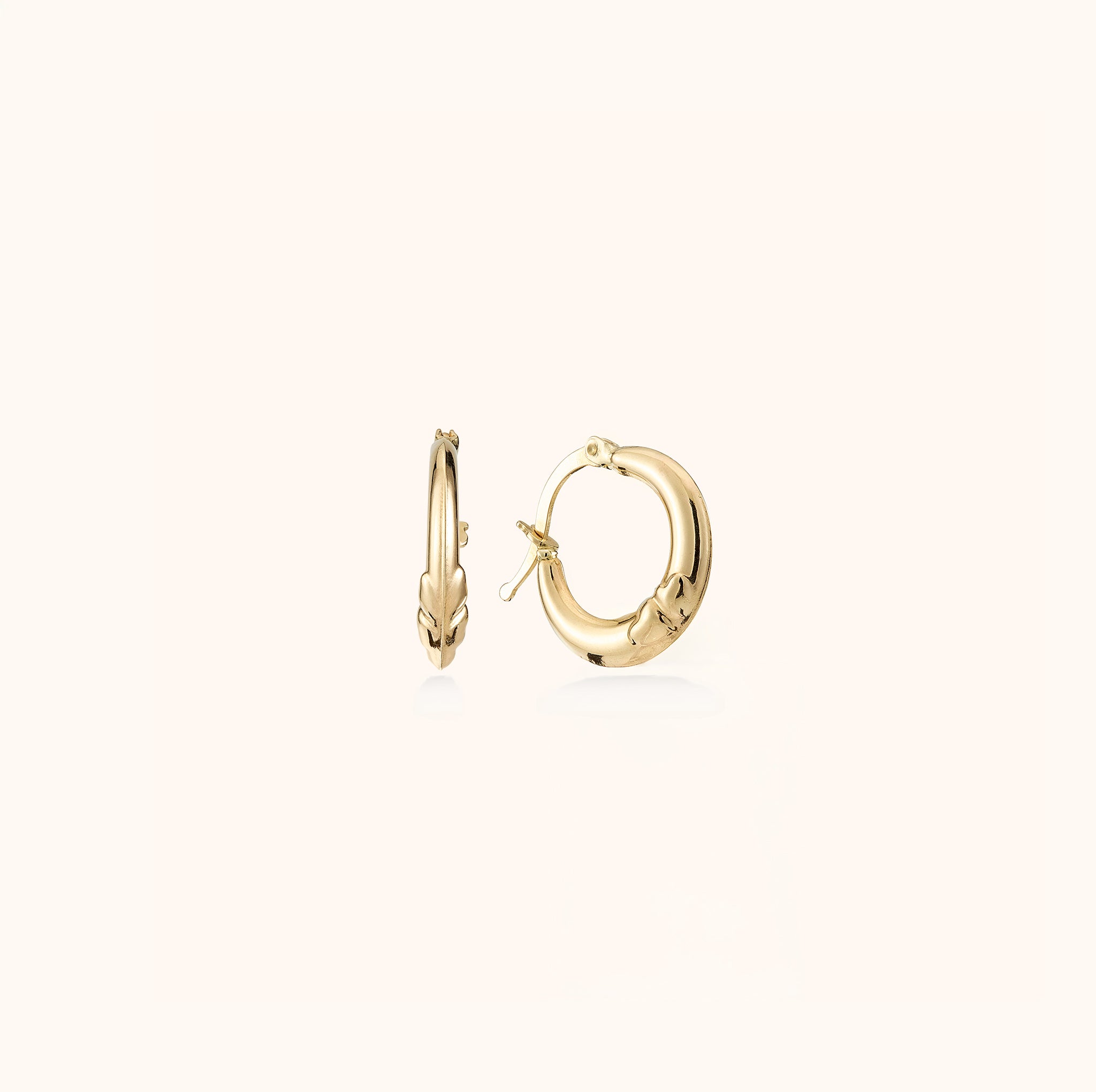 Doğanın zarafetini simgeleyen kabartma figür detayını parlak altın halka formuyla buluşturan bu küpe, yalın tasarımını sanatsal bir dokunuşla tamamlayarak stilinize naif bir ışıltı katıyor.