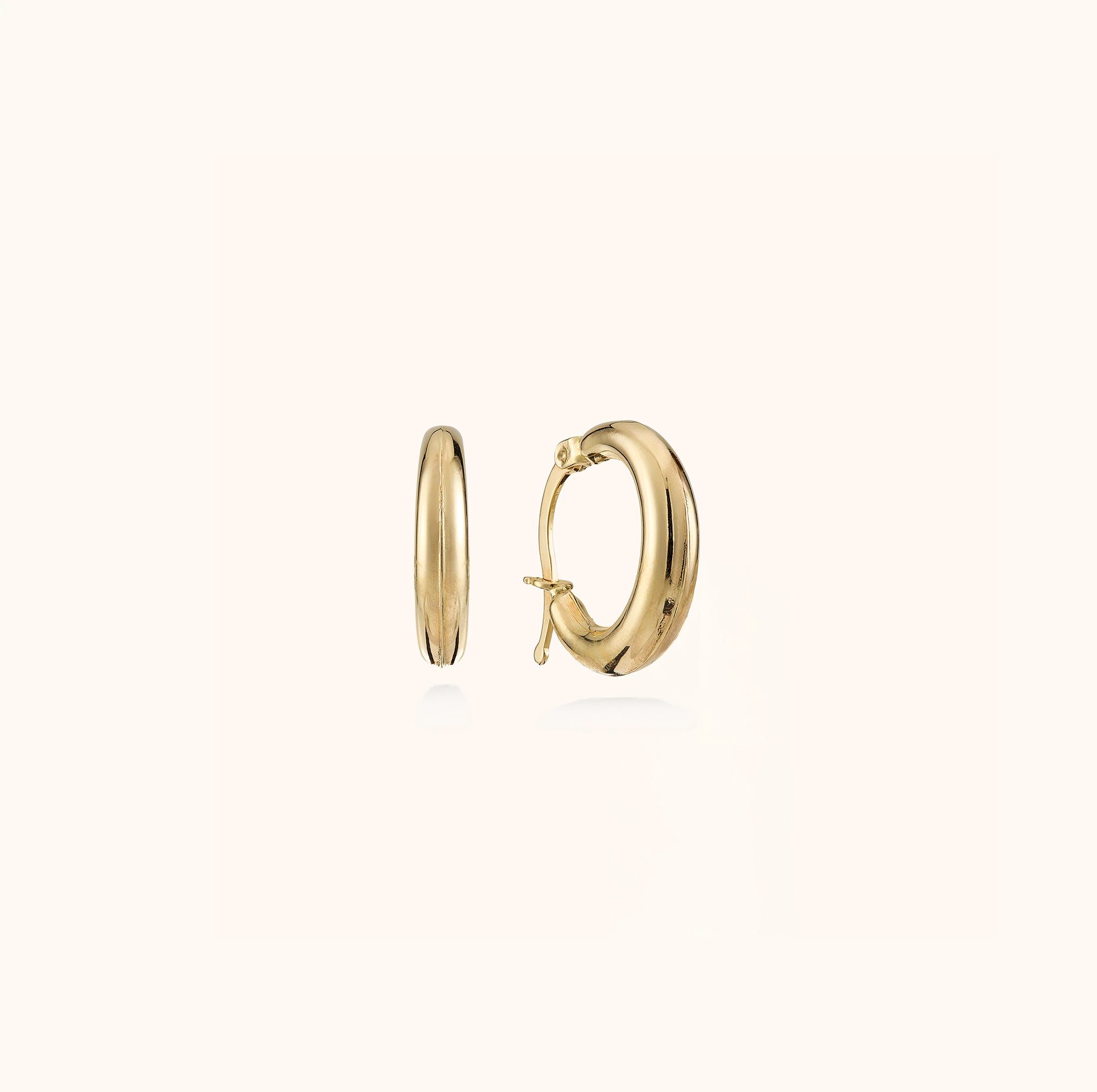 Sade tasarımın gücünü altın ışıltısıyla buluşturan bu bombeli halka küpeler, pürüzsüz hatları ve zamansız formuyla hem günlük stilinizin hem de en şık anlarınızın vazgeçilmez tamamlayıcısı olacak.