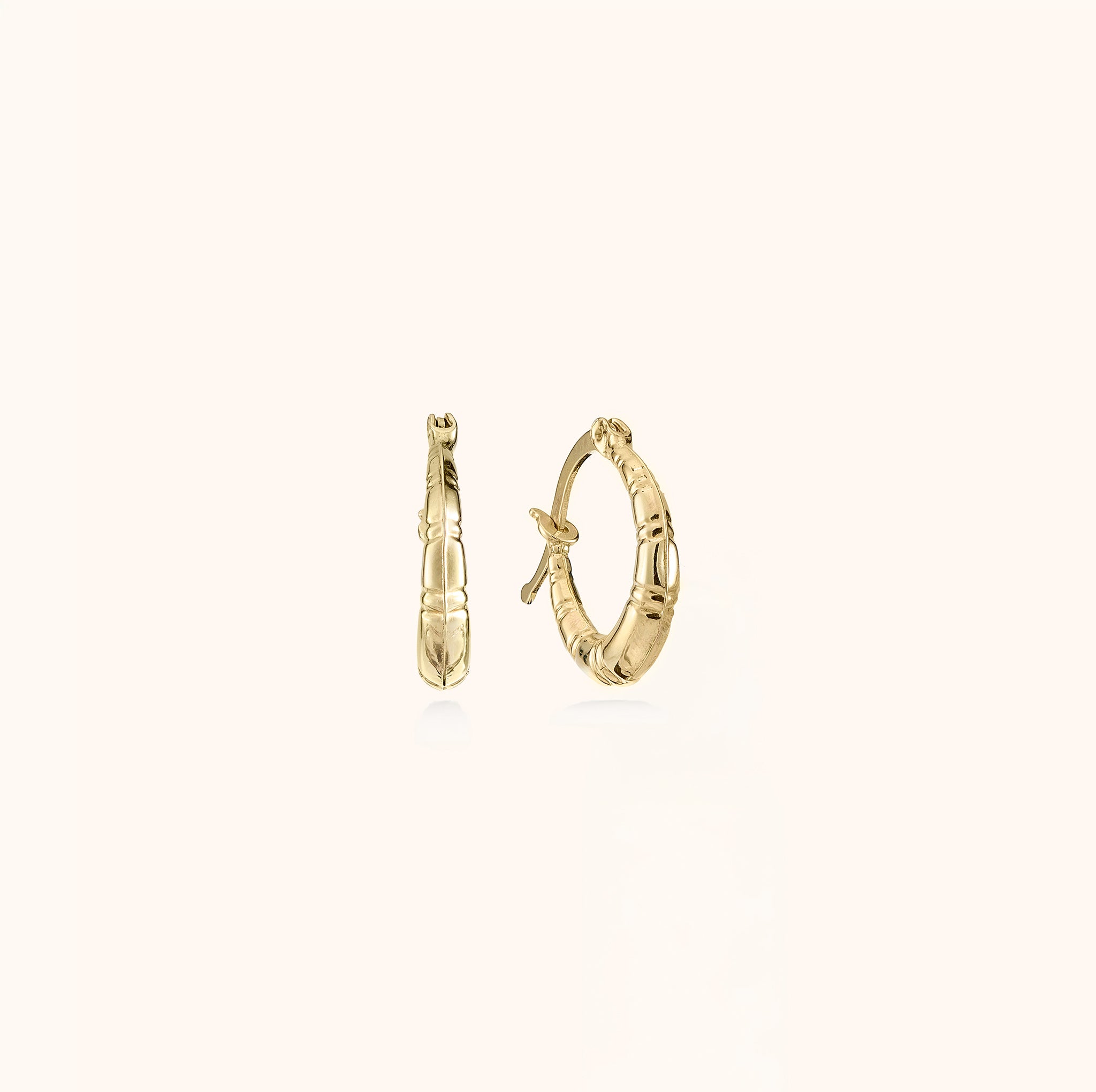 Altının hacimli formunu modern çizgisel dokularla yeniden yorumlayan bu bombeli küpeler, her bir dilimine işlenen özel kalem detaylarıyla stilinize mimari bir derinlik ve ışıltı katıyor.