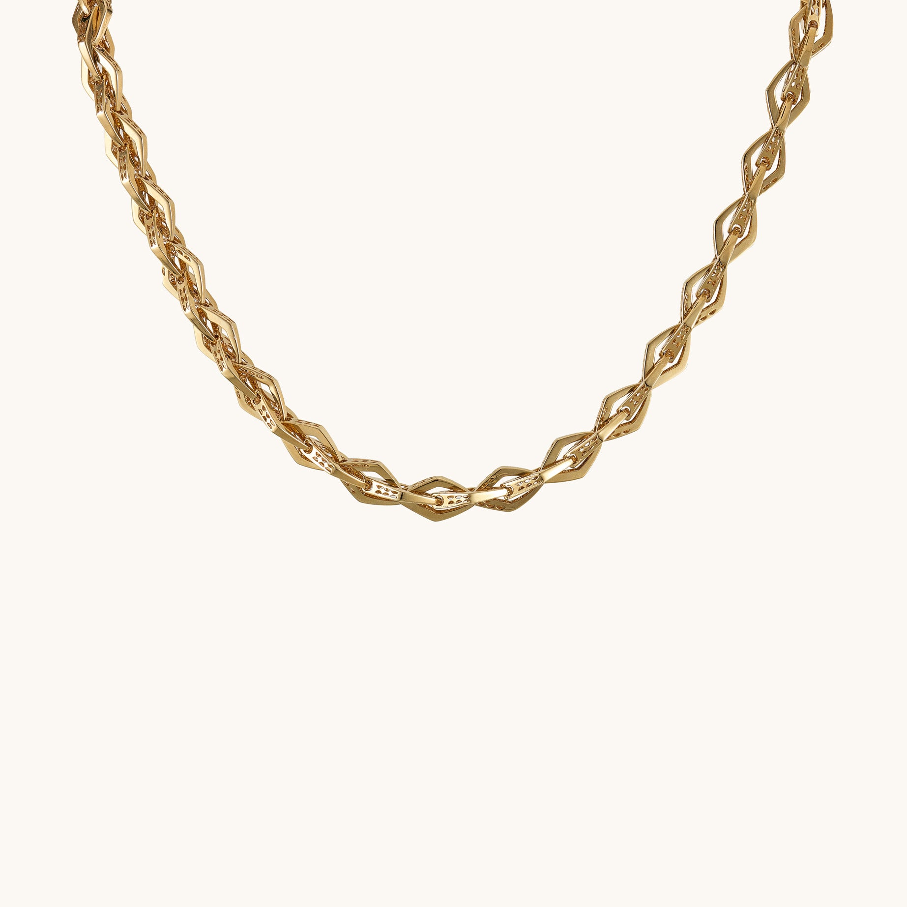 Keskin geometrik formların kusursuz bir simetriyle birleştiği bu 14 ayar altın zincir kolye, modern tasarımın gücünü altının zamansız ışıltısıyla boynunuza taşıyor.