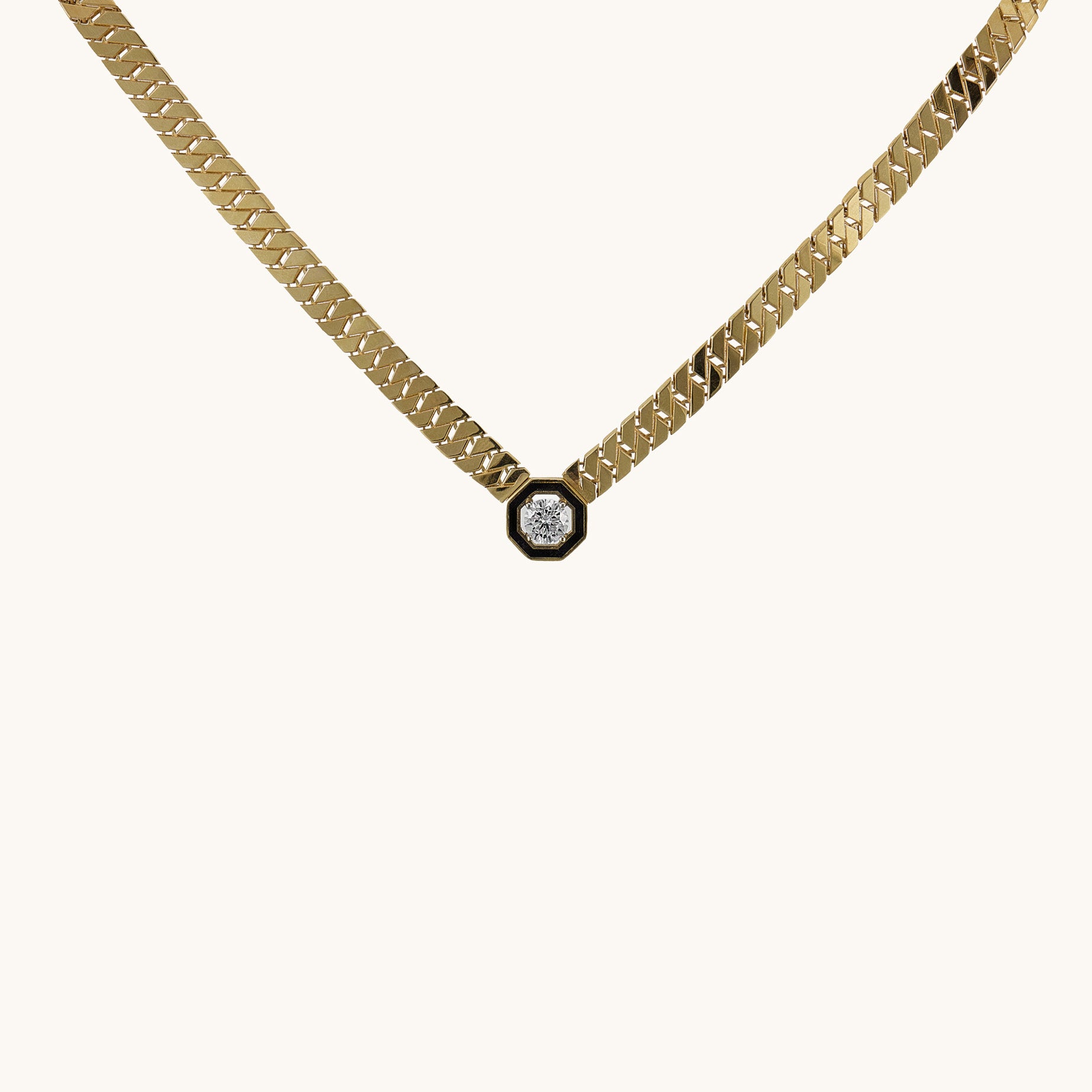 Keskin hatlı gurmet zincirin modern duruşunu merkezdeki ışıltılı tek taşla taçlandıran bu kolye, yalın tasarımı ve güçlü karakteriyle stilinize sofistike bir imza atıyor.