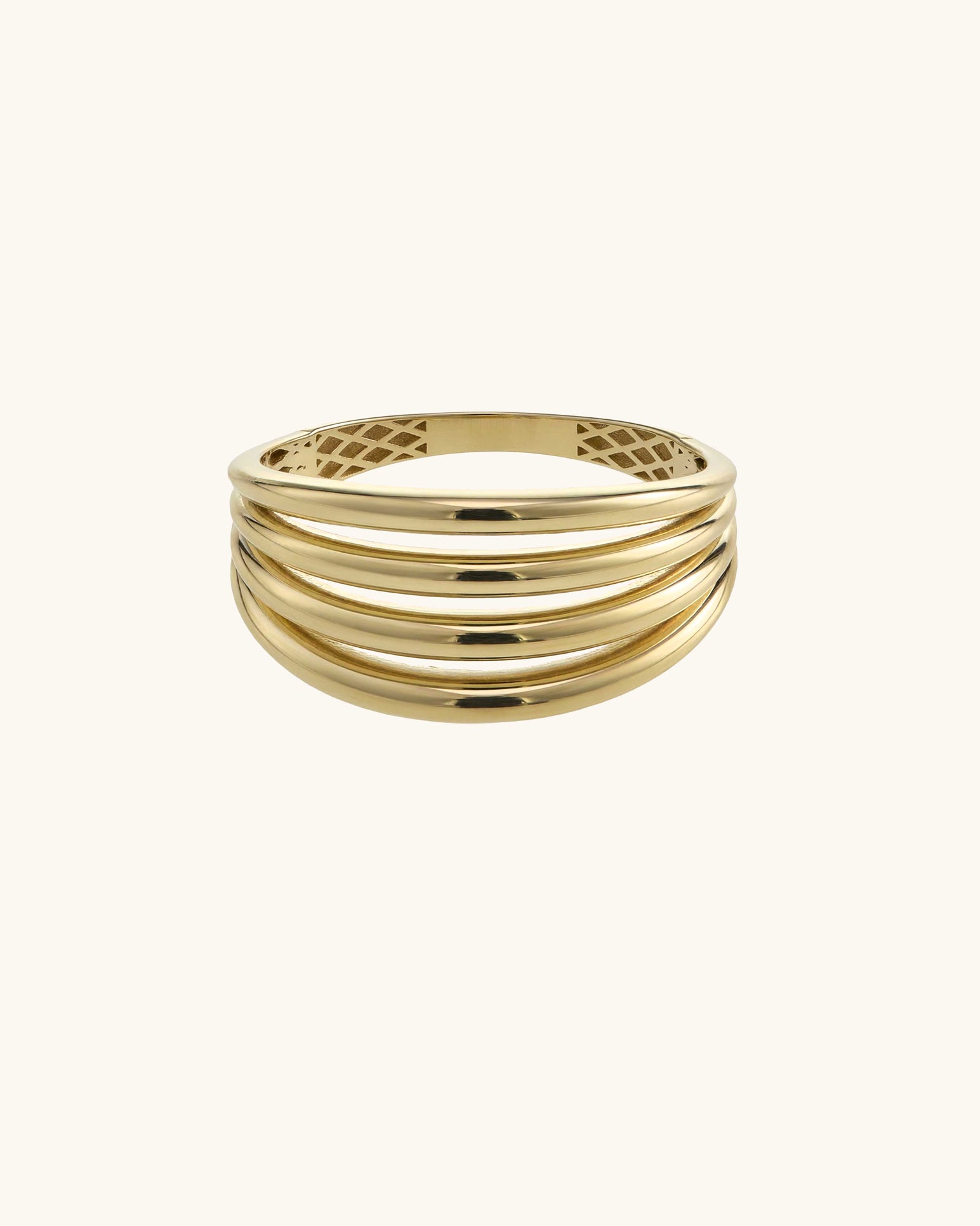 Dört sıralı yalın hatları ve yüksek parlaklıktaki altın dokusuyla bu yüzük, taşsız zarafeti modern bir hacimle parmağınıza taşıyor.