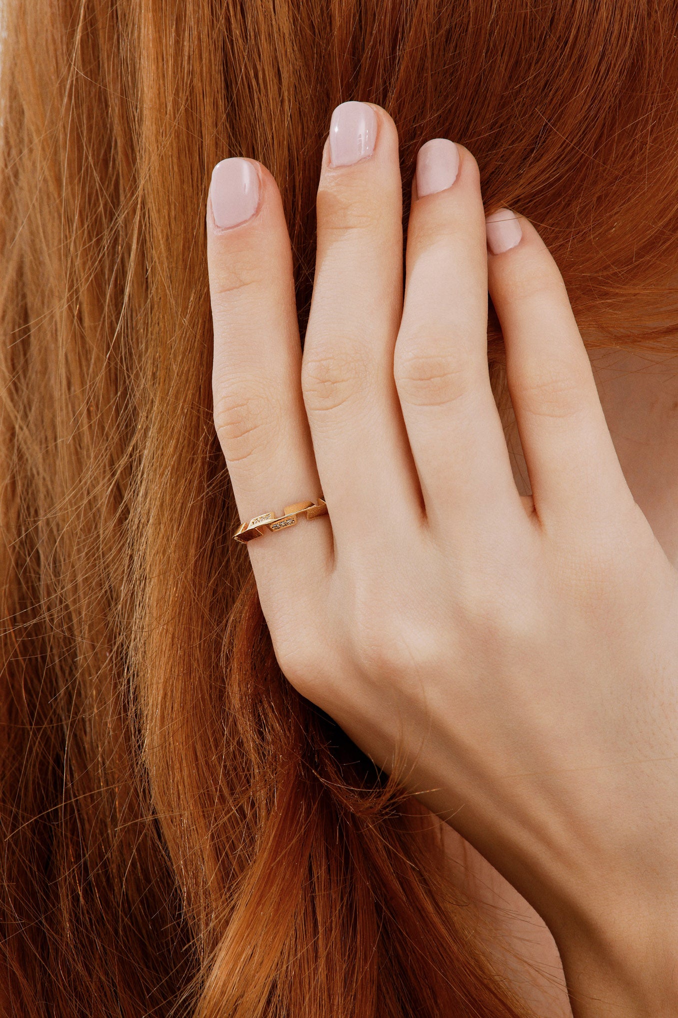 Geometrik Kesim Yüzük, özgünlüğün zarif simgesi olup blok geçişli modern formu ve parlayan taşlarıyla günlük kombinlerinize dinamik bir ışıltı katar.