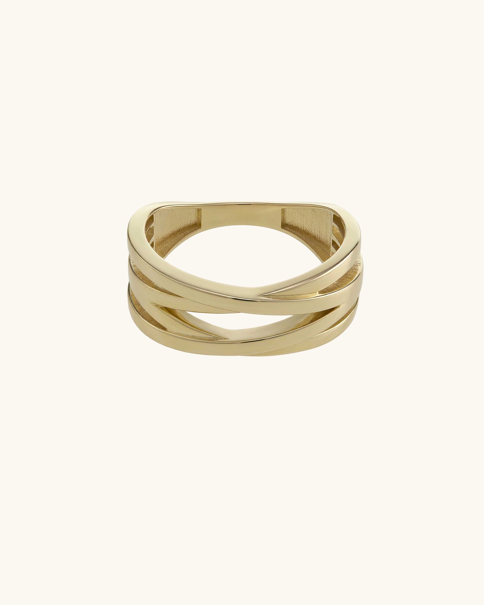 İki zarif hattın çapraz geçişlerle birleştiği bu modern yüzük, taşsız tasarımın duruluğunu iddialı bir formla parmağınıza taşıyor.