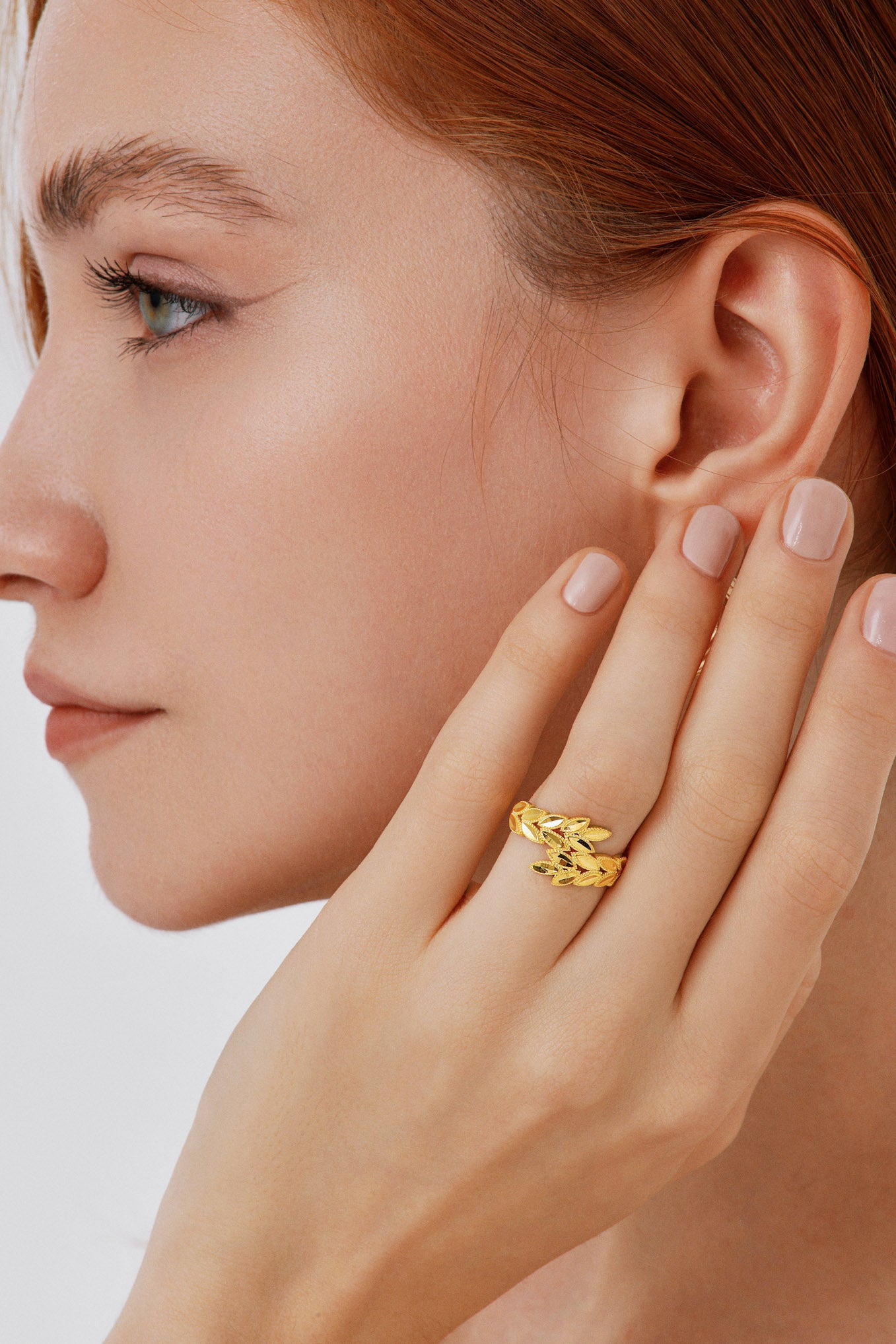 Sarmal Çift Yaprak Figürlü Yüzük, doğanın estetik akışını modern bir tasarımla birleştirerek parmağınızda zarif ve hareketli bir ışıltı sergiler.
