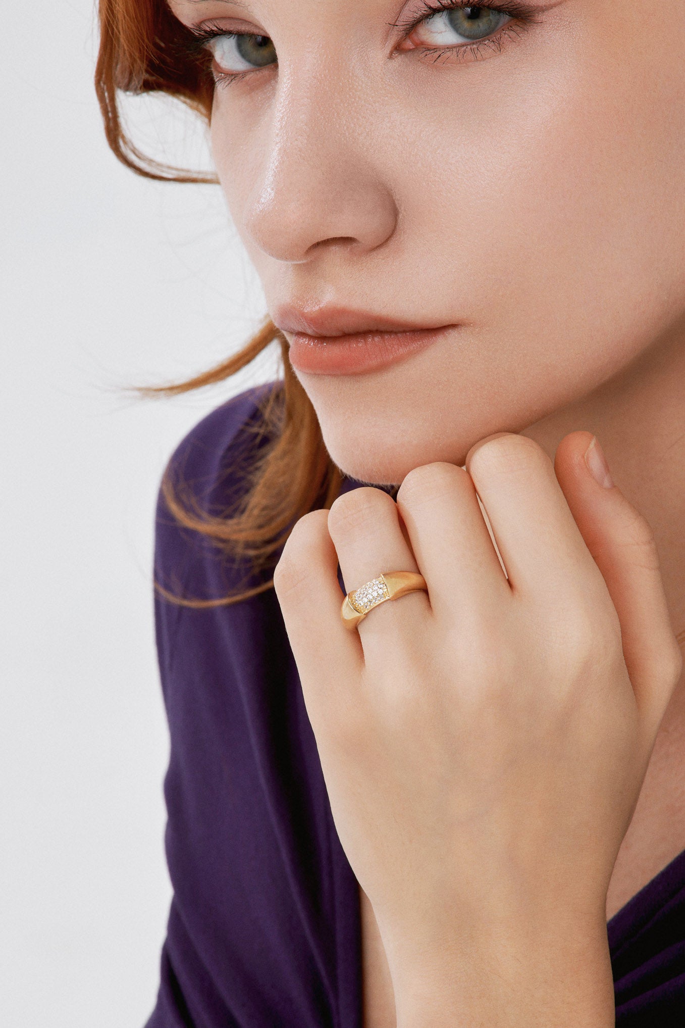 Taşlı Orta Panel Bombeli Yüzük, zarafetin modern simgesi olup güçlü hacimli formu ve merkezdeki ışıldayan taşlarıyla günlük kombinlerinize sofistike bir dokunuş katar.