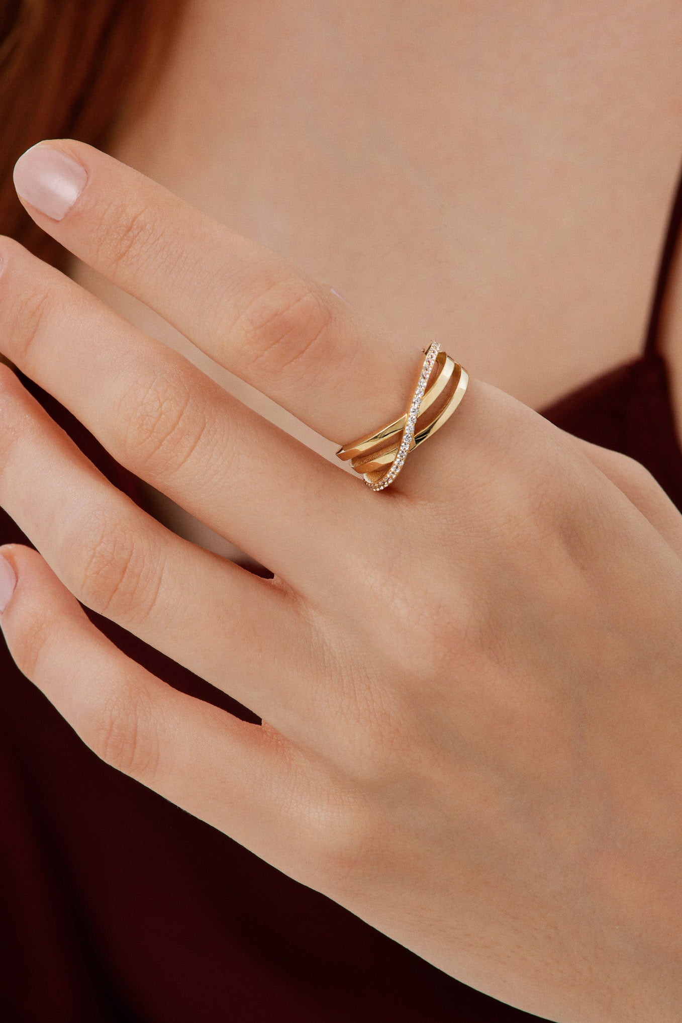Üçlü sarmal yapının modernliğini tek sıra taşın zarif ışıltısıyla taçlandıran bu yüzük, geometrik estetiği parmağınıza taşıyor.