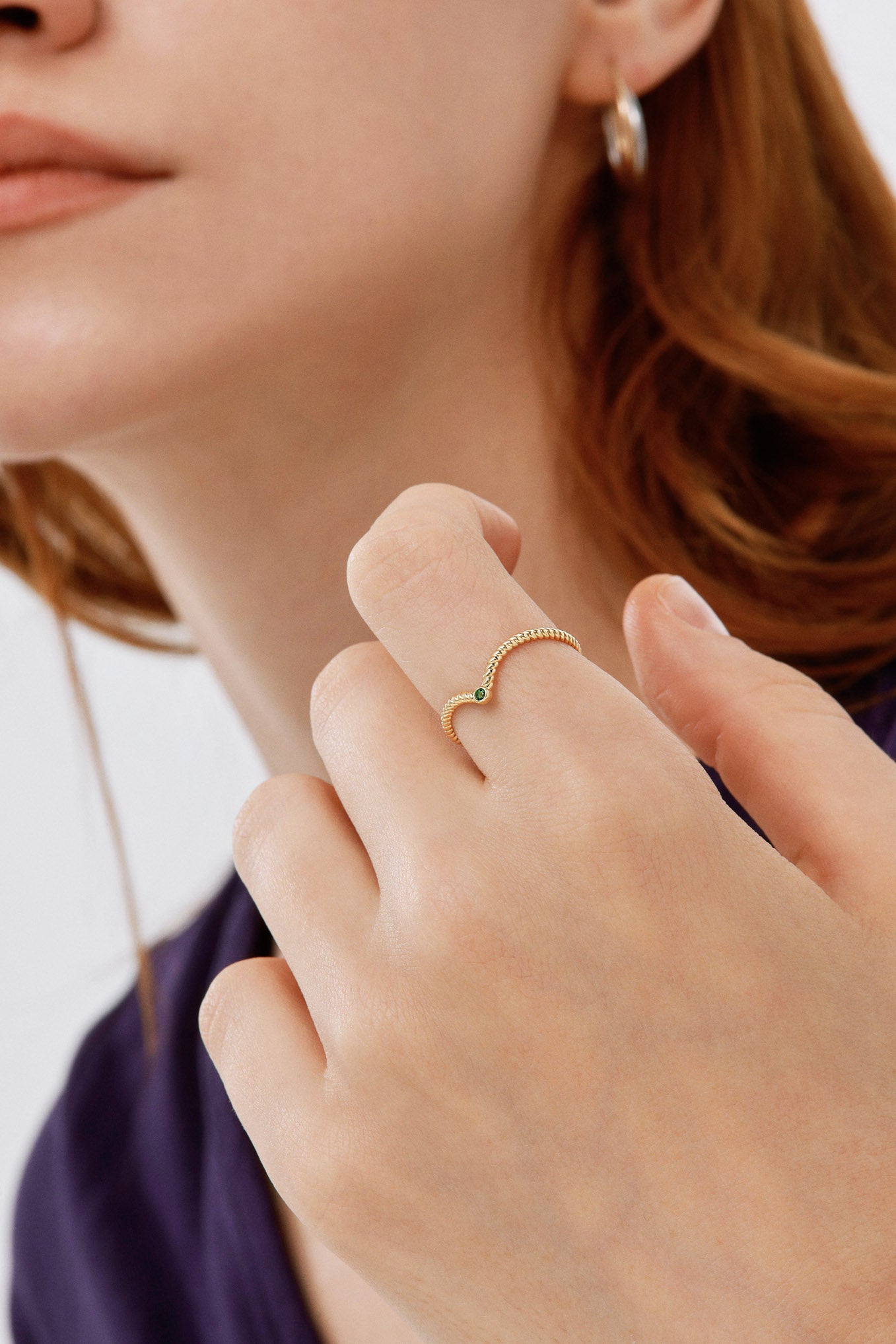 Minimalist bir zarafeti simgeleyen bu tasarım, burgu dokusunun yarattığı klasik havayı V formunun modern geometrisi ve yeşil taşın romantik ışıltısıyla birleştirerek parmağınızda narin bir imza bırakır.