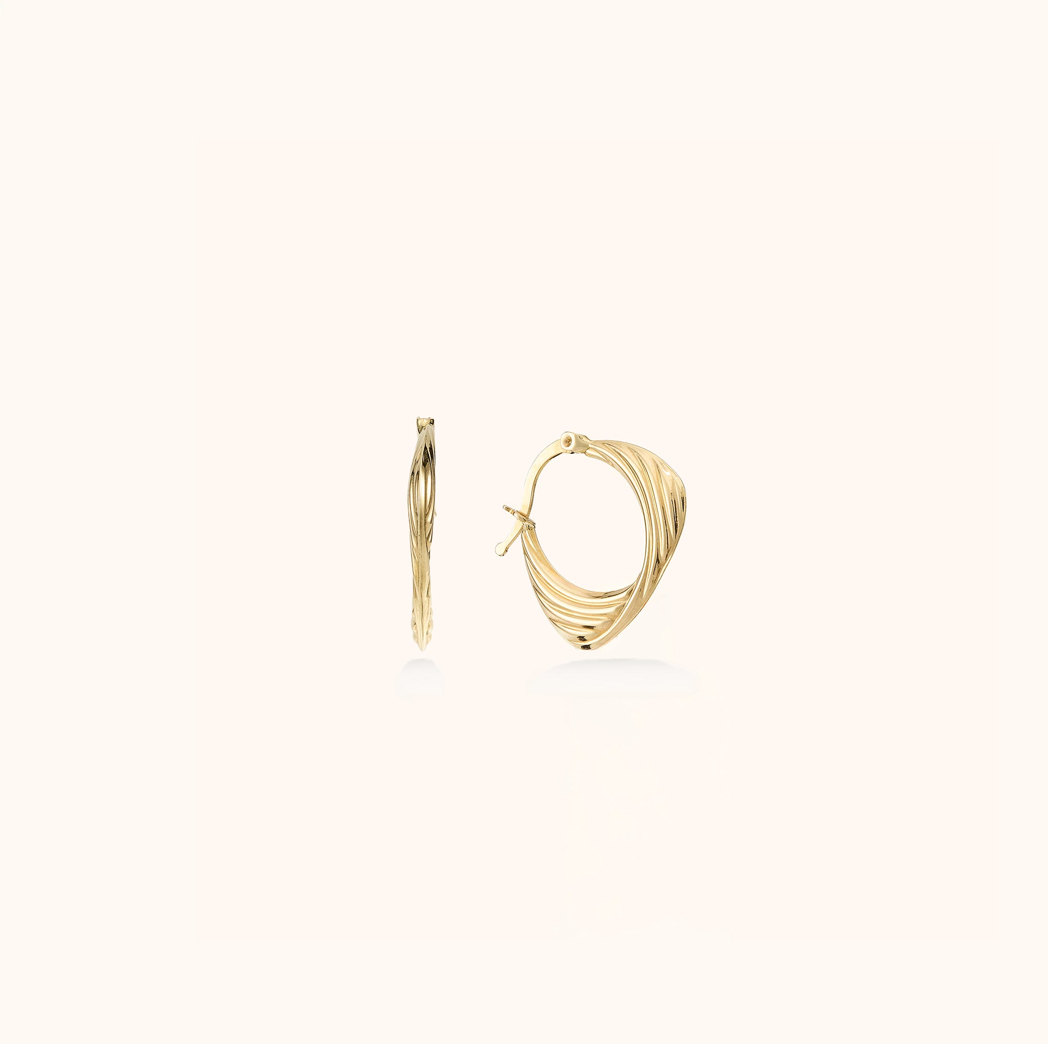 Asimetrik dalga hatlarını altının büyüleyici ışıltısıyla harmanlayan bu 14 ayar küpe, alışılmışın dışındaki formuyla stilinize modern ve dinamik bir karakter kazandırıyor.