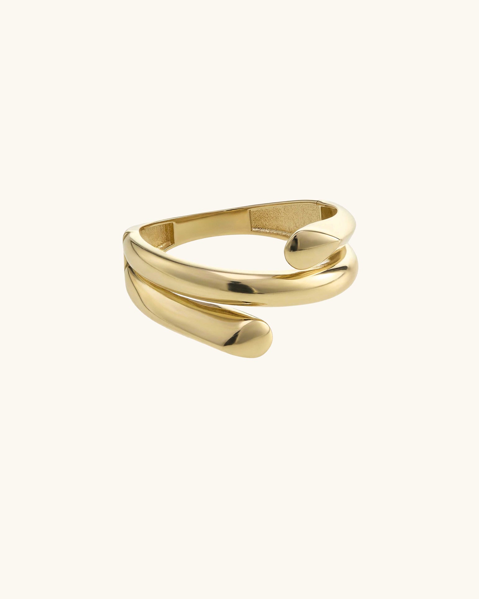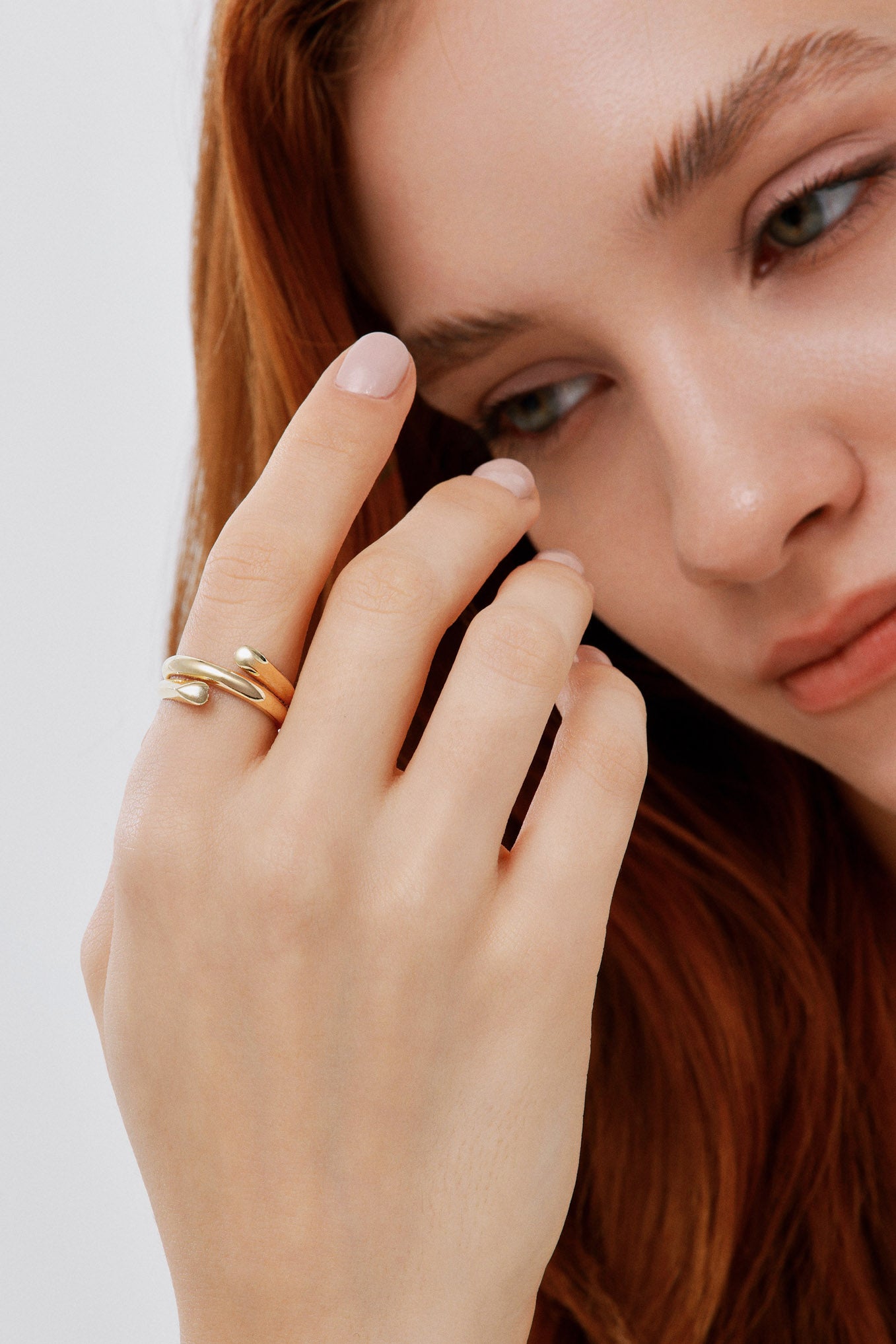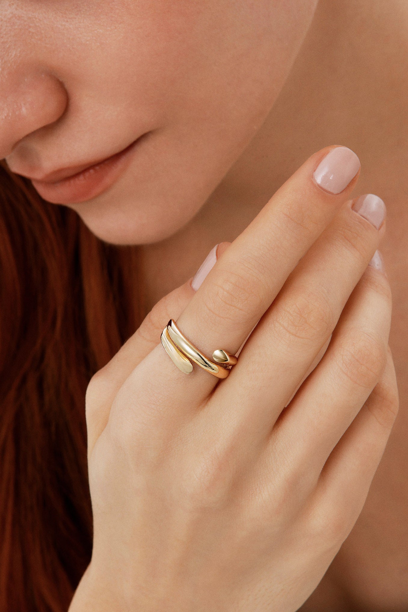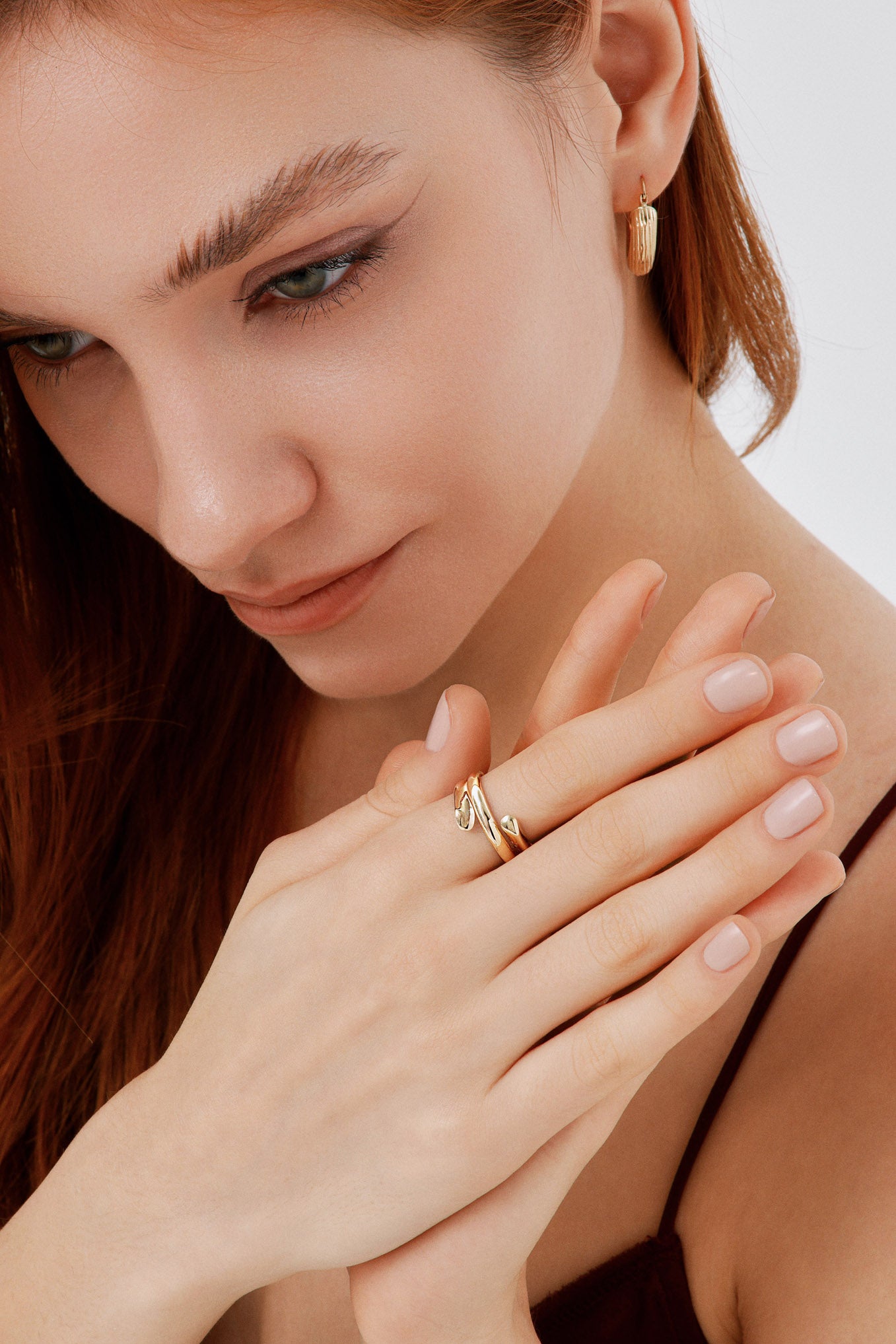 Modern ve asimetrik kavislerin altın ışıltısıyla buluştuğu bu tasarım yüzük, taşsız şıklığın en minimal ve sanatsal halini stilinize taşıyor.