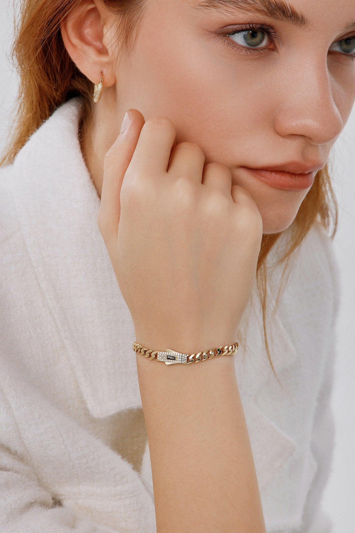 Altının yalın ve güçlü duruşunu merkezine alan bu tasarım, sade zincir halkalarını ışıltılı bir kilit detayıyla taçlandırarak gündüzden geceye her tarza eşlik edebilecek zamansız bir zarafet sunar.