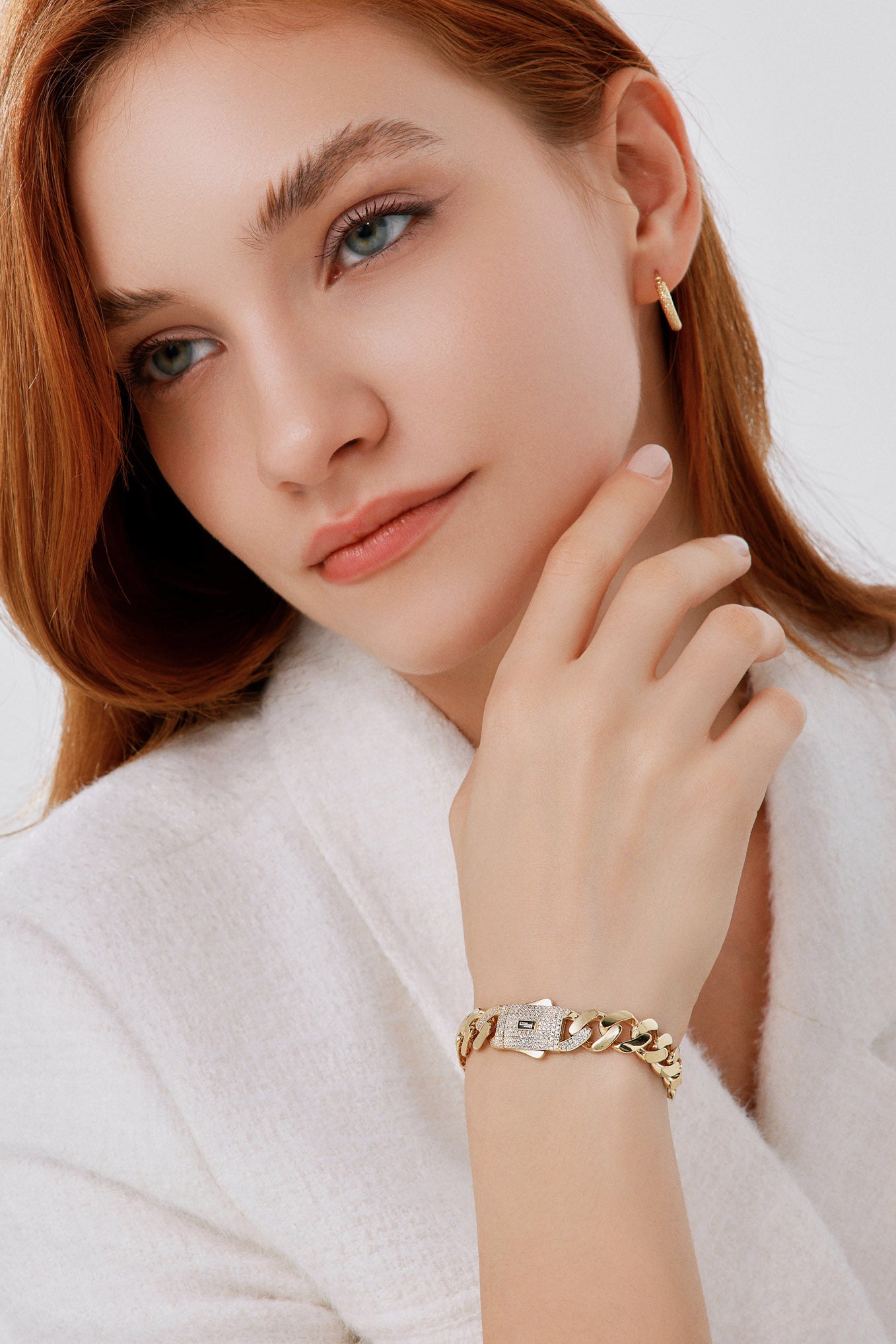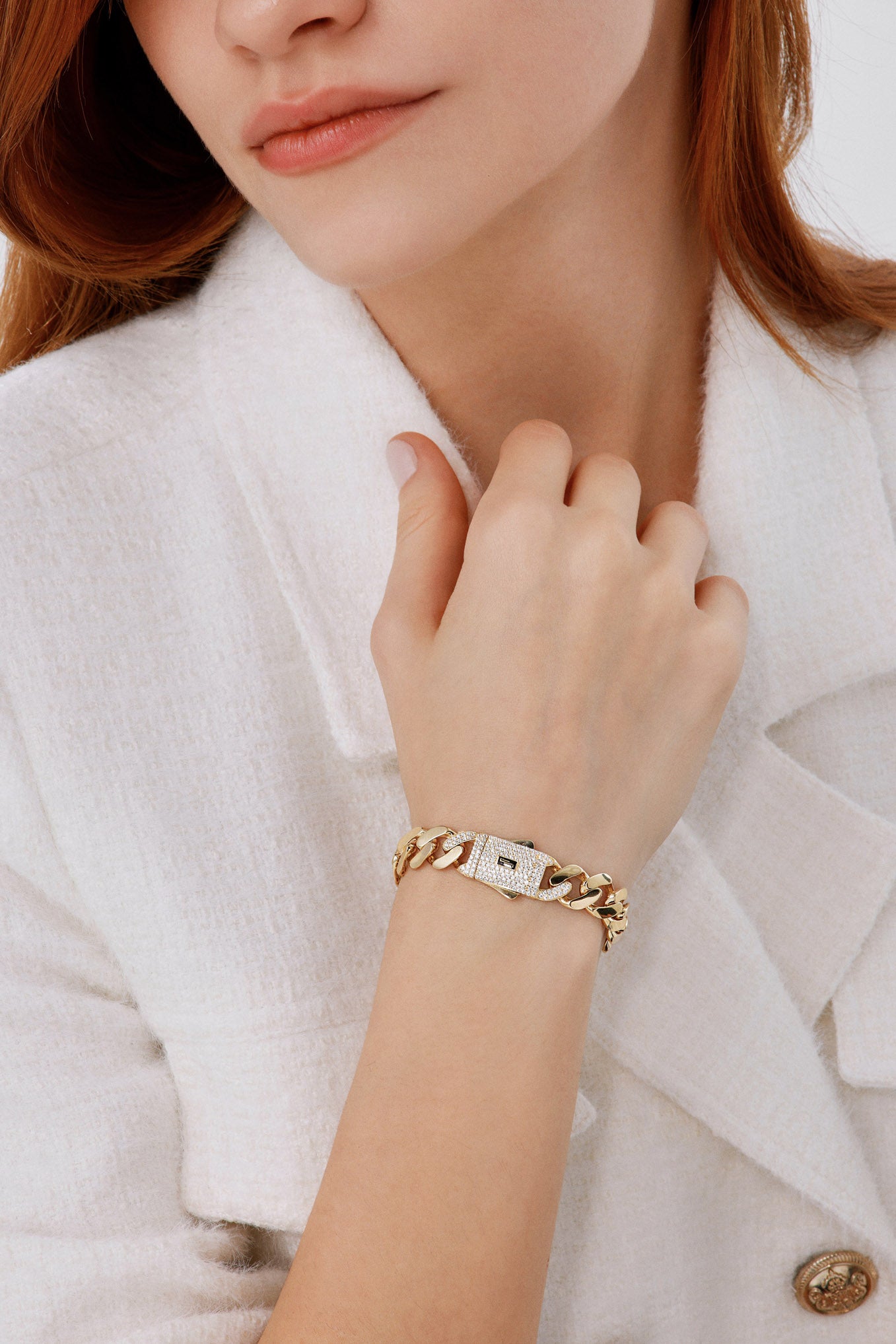 Altının yalın ve güçlü duruşunu merkezine alan bu tasarım, sade zincir halkalarını ışıltılı bir kilit detayıyla taçlandırarak gündüzden geceye her tarza eşlik edebilecek zamansız bir zarafet sunar.