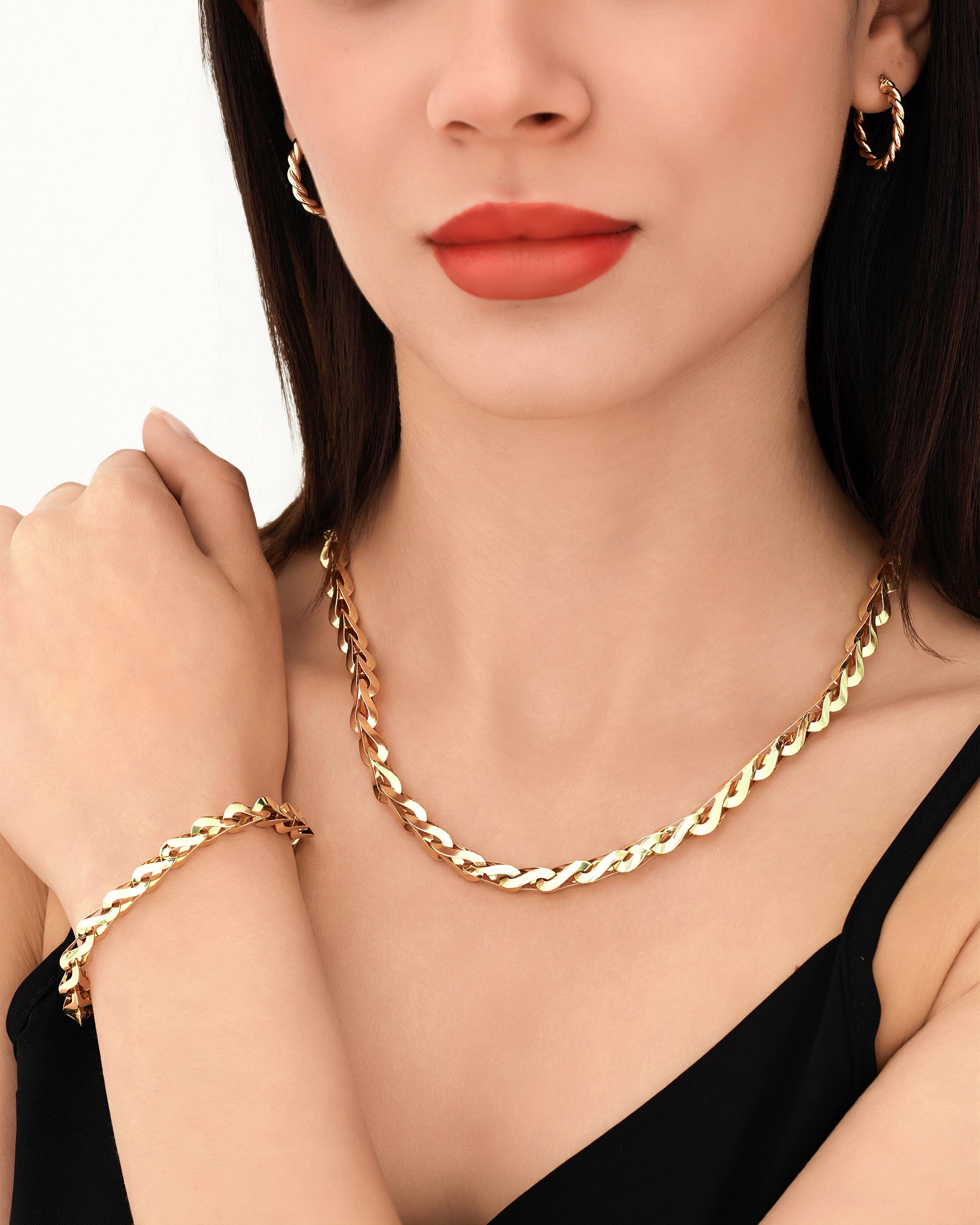 Göz alıcı parlaklığa sahip bu altın bileklik, iç içe geçmiş bükümlü zincir formuyla güçlü ve sofistike bir duruş sergiliyor. Kalın yapısı ve parlak yüzeyiyle bilekte dikkat çekici bir ışıltı sunarken, modern tasarımı sayesinde günlük ya da özel kombinlerinize iddialı bir dokunuş katar.