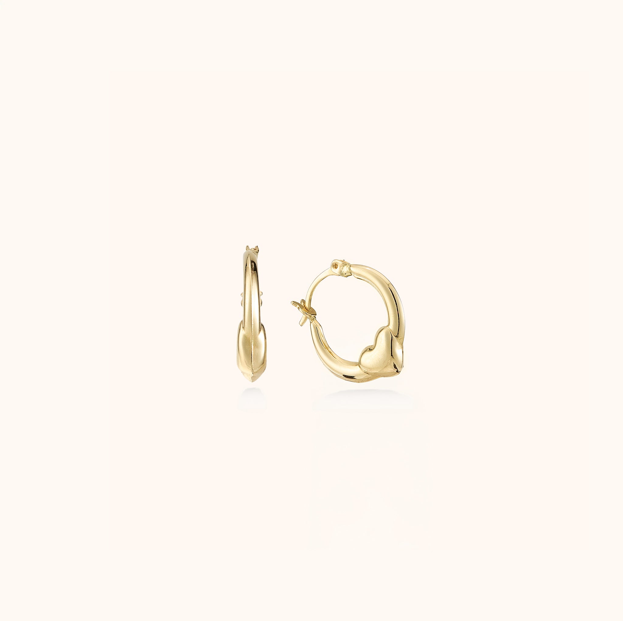 Pürüzsüz altın halkanın sadeliğini merkezdeki dolgun kalp figürüyle taçlandıran bu küpe, romantik tasarımı ve ışıltılı yüzeyiyle stilinize sevgi dolu ve modern bir dokunuş katıyor.
