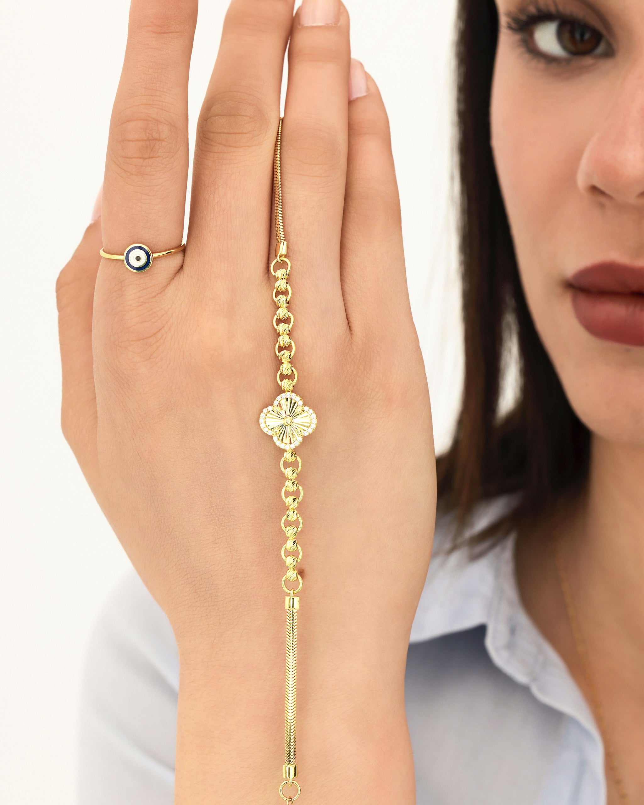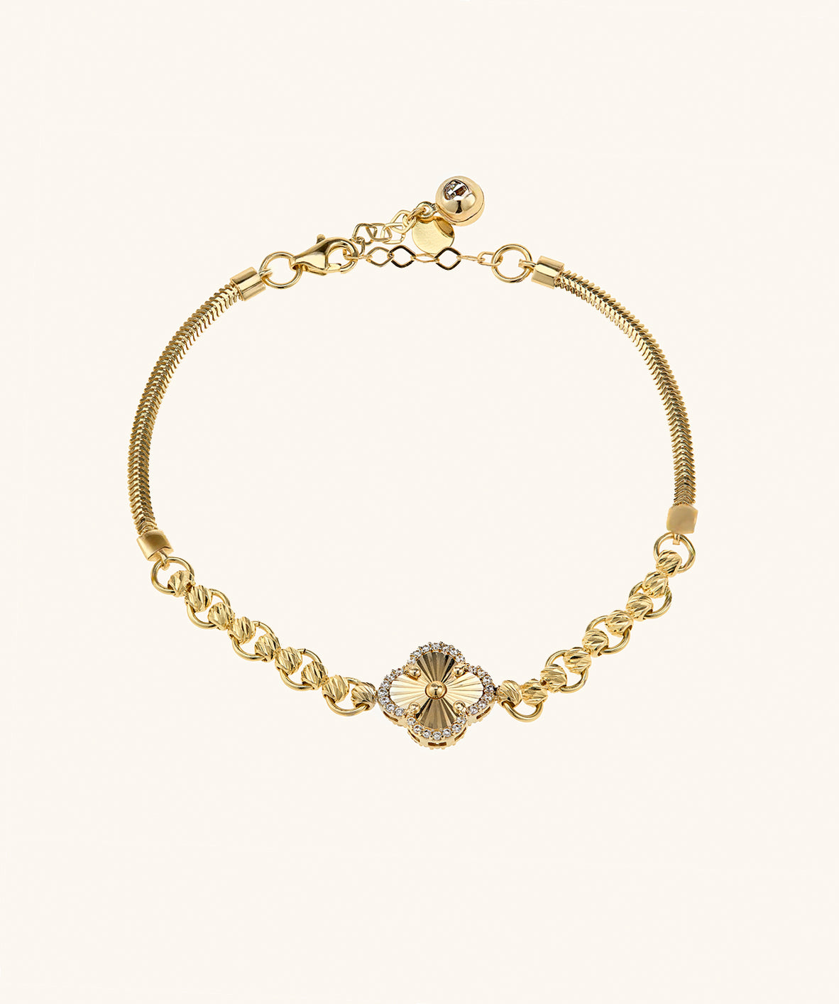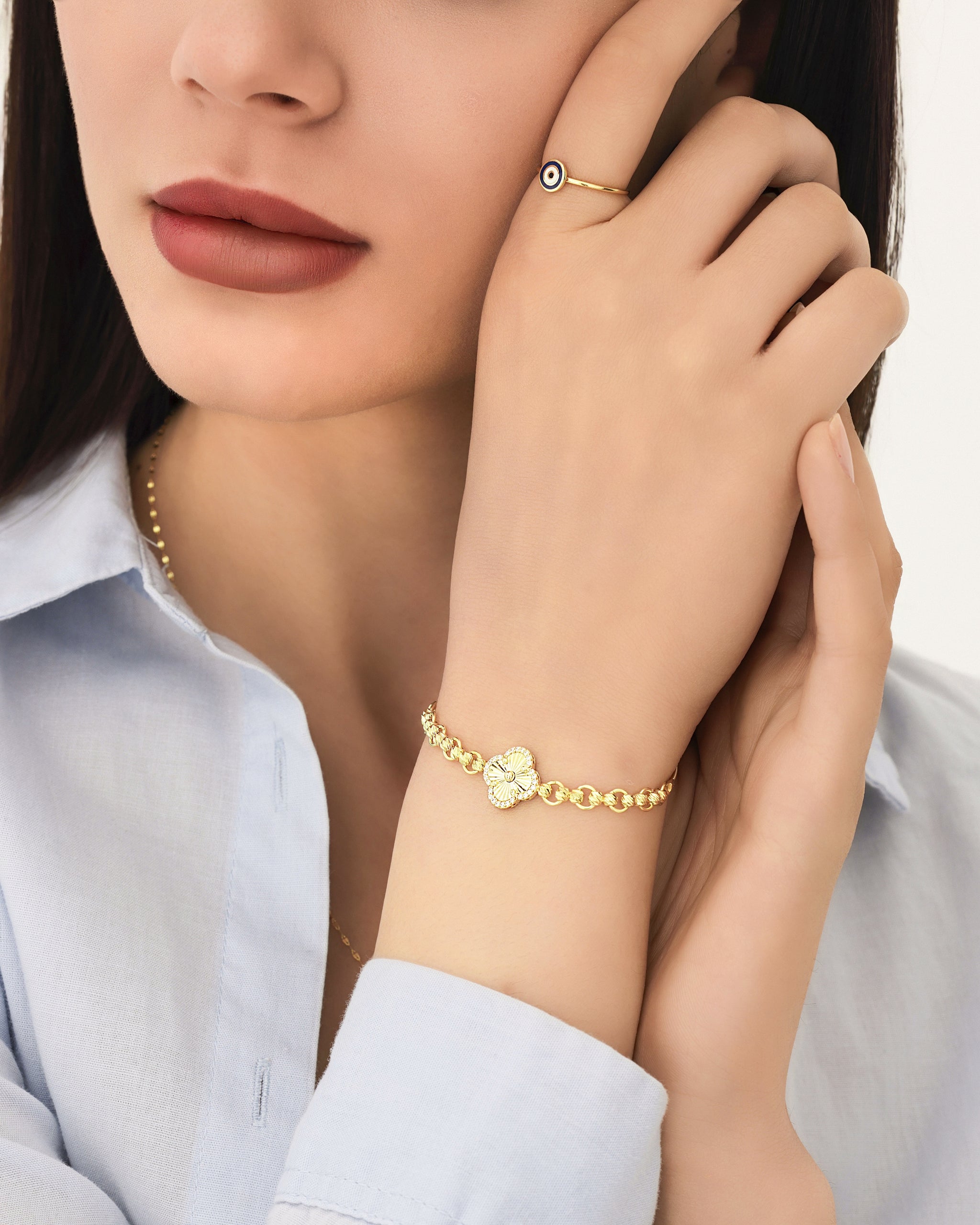 Şıklığı ve zarafeti bir araya getiren bu 14 ayar altın bileklik, merkezinde yer alan çiçek formundaki ışıltılı motifle dikkat çeker. Örgü detaylı halkalar ve esnek zincir yapısı sayesinde hem konforlu hem de gösterişli bir kullanım sunar. Günlük stilinizi zarif bir şekilde tamamlayacak bu özel tasarım, her bilekte asil bir duruş sergiler.